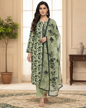Elegant 3-Piece Printed Light Khaddar Suit with Lace Detailing – Black & Olive Green