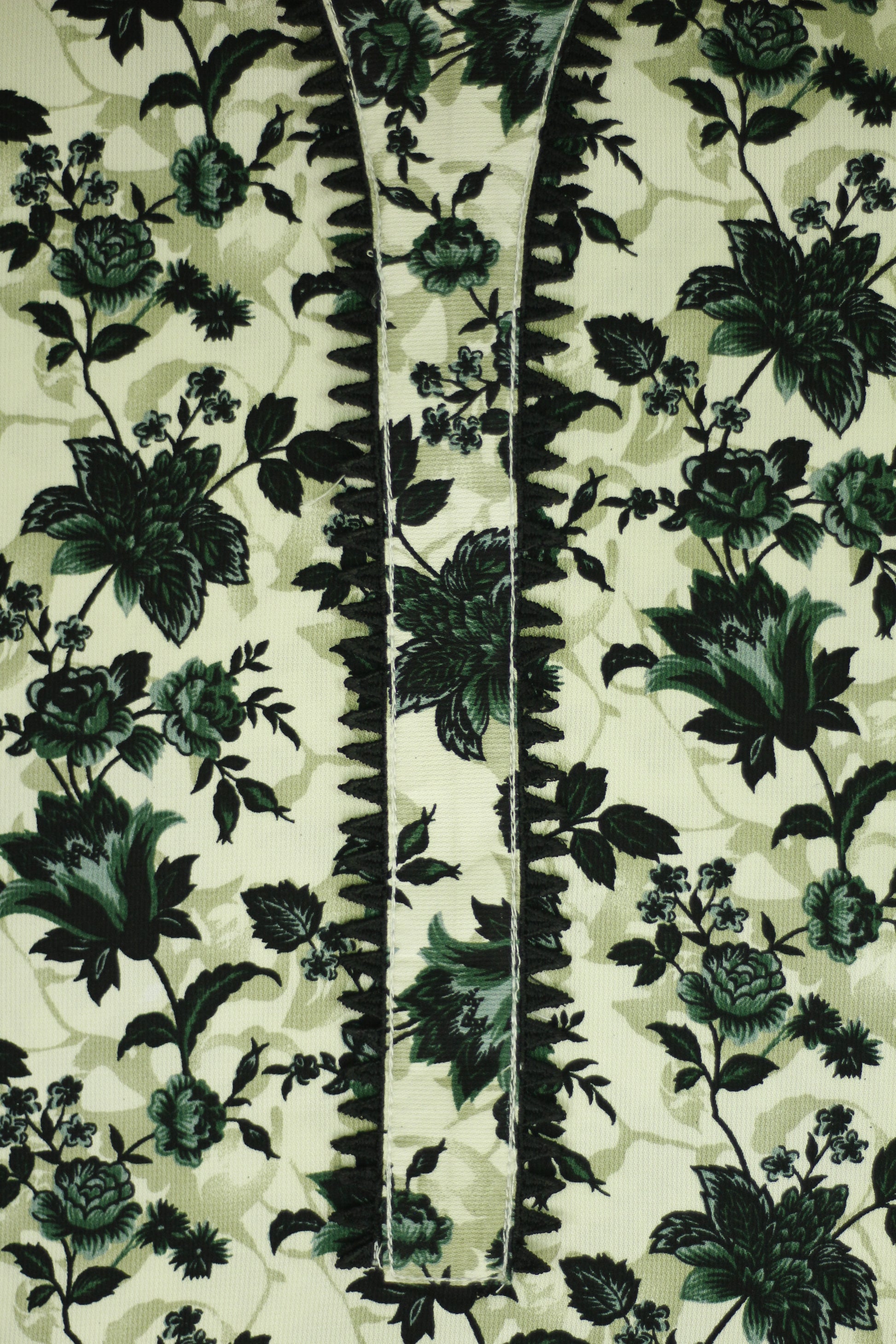 The suit features a cream white base adorned with small green floral designs, creating a subtle yet stylish aesthetic perfect for casual outings, office wear, or festive events.